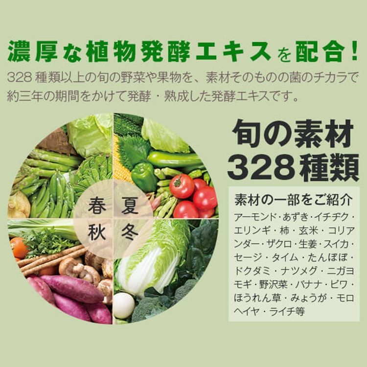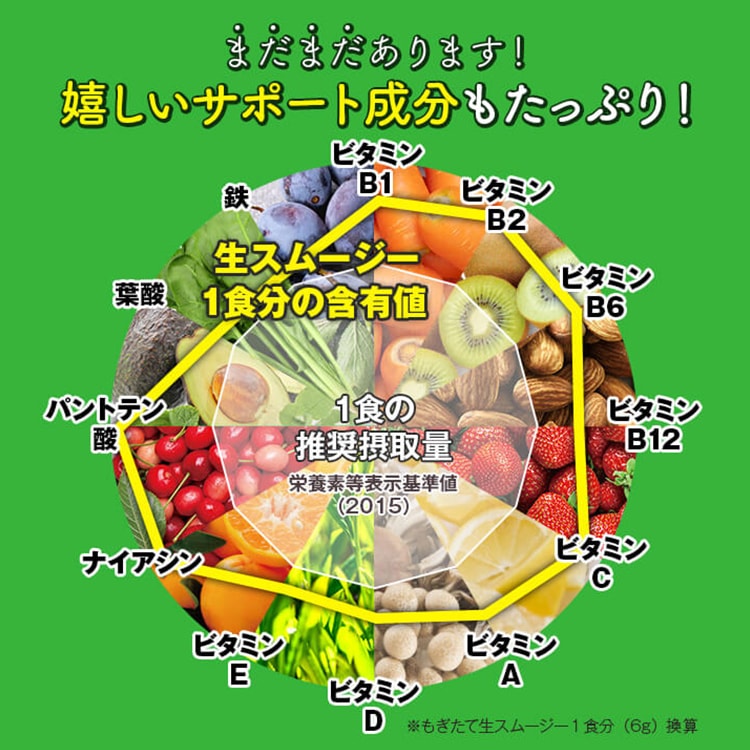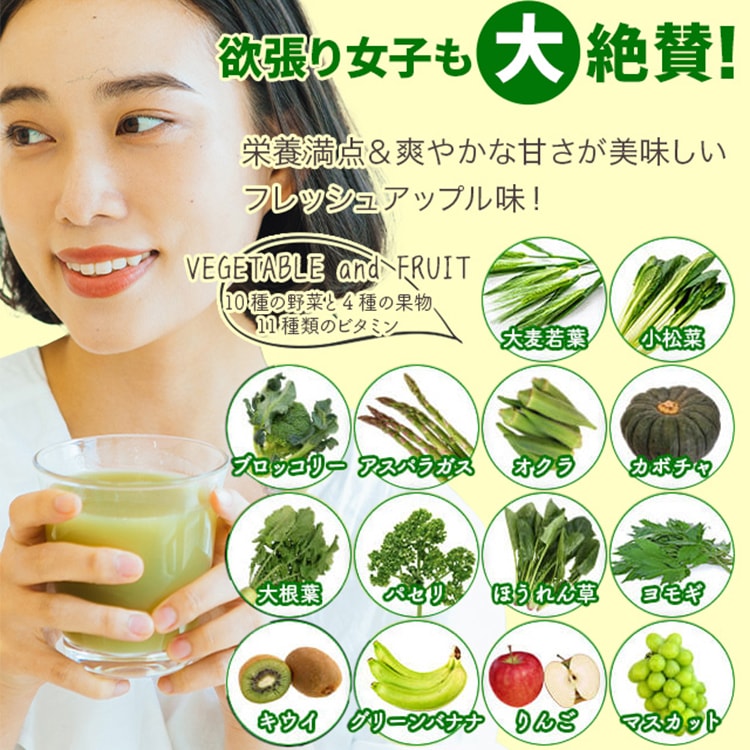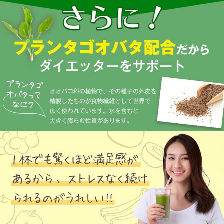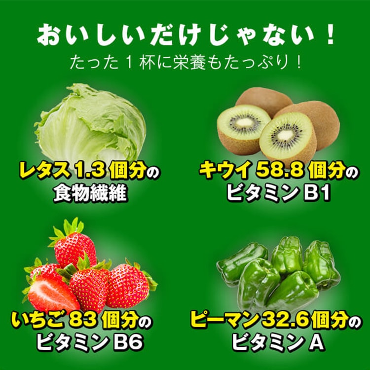 - 還元麦芽糖(国内製造)、ポリデキストロース(水溶性食物繊維)、大麦若葉末、食塩、コマツナ末、ブロッコリー末、スピルリナ末、パパイヤエキス、植物発酵エキス(オレンジ・カシューナッツ・ごま・大豆・アーモンドを含む)、殺菌乳酸菌混合末(乳成分を含む)、アスパラガス末、イヌリン(水溶性食物繊維)、オート麦食物繊維、オクラ末、カボチャ末、カルシウム(天然水由来)、キウイフルーツ果汁末、キダチアロエ末、グルコマンナン、クロレラ末、コラーゲンペプチド(ゼラチンを含む)、ダイコン葉末、チアシード末、パセリ末、バナナ末、プランタゴオバタ末、ホウレンソウ末、ユーグレナ末、ヨモギ末、りんご果汁末、りんご食物繊維、難消化性デキストリン(水溶性食物繊維)、有機アカシア食物繊維、マスカット果汁末/増粘多糖類、酸味料、甘味料(アスパルテーム・L-フェニルアラニン化合物、スクラロース)、ビタミンC、クエン酸カルシウム、ピロリン酸第二鉄、香料、ビタミンE、ナイアシン、パントテン酸カルシウム、ビタミンB1、ビタミンA、ビタミンB6、ビタミンB2、葉酸、ビタミンD、ビタミンB12