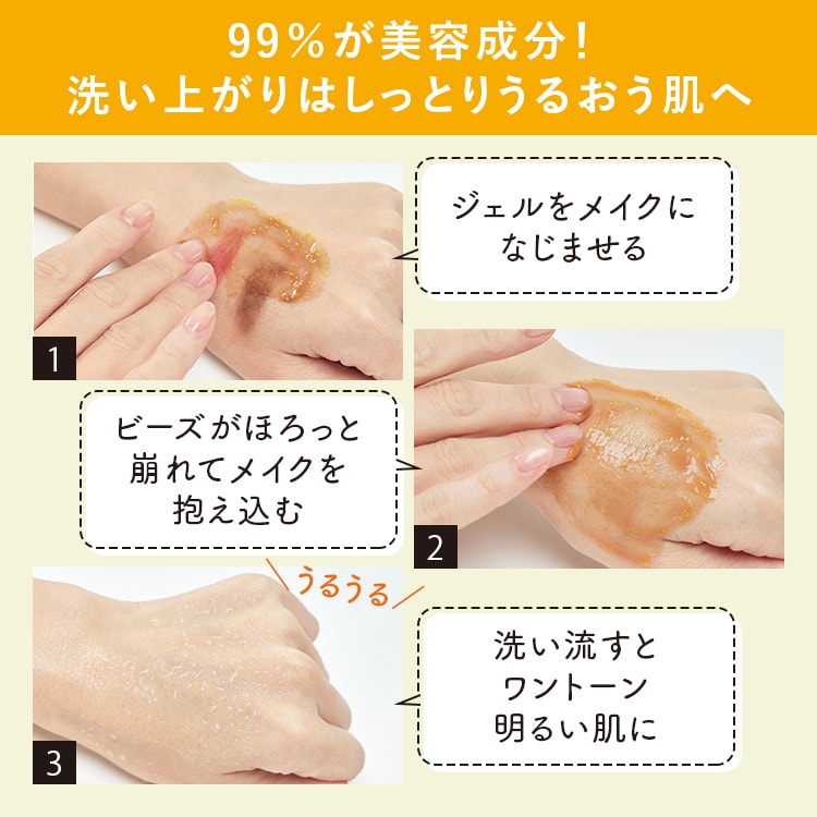 - お顔の水分をおさえてから、1回分マスカット粒大を手にとり、黄色いビーズをつぶしながら内側から外側に向かってお顔全体になじませます。ジェルがとろりと溶けた感触後に、水、又はぬるま湯で洗い流してください。