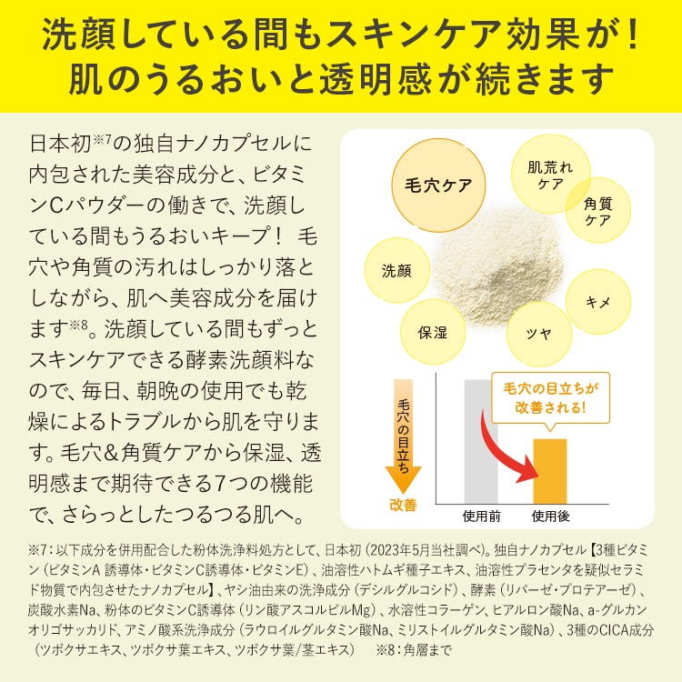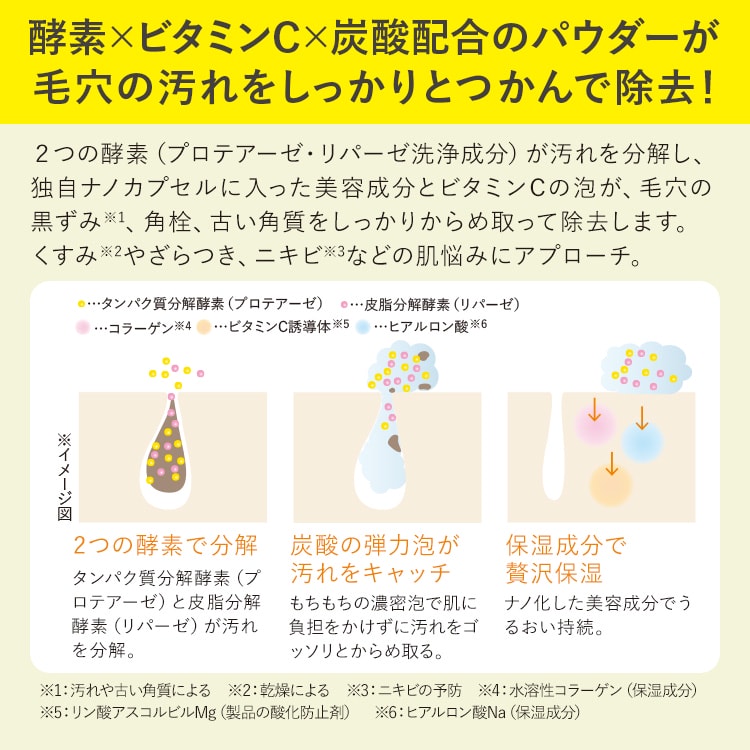 - タルク、結晶セルロース、ラウリルリン酸Na、ラウリン酸K、ラウロイルグルタミン酸Na、パーム脂肪酸グルタミン酸Na、ミリスチン酸K、マンニトール、ココイルイセチオン酸Na、ココイルグルタミン酸Na、水、ラウラミドプロピルベタイン、クエン酸、炭酸水素Na、塩化Na、α-グルカンオリゴサッカリド、リン酸アスコルビルMg、リパーゼ、シクロデキストリン、ヒアルロン酸Na、フェノキシエタノール、プロテアーゼ、ツボクサ葉エキス、ニオイテンジクアオイ油、テレビン油、エンピツビャクシン油、ダマスクバラ花油、ツボクサエキス、ミリストイルグルタミン酸Na、ツボクサ葉/茎エキス、BG、デシルグルコシド、水溶性コラーゲン、グリセリン、イソステアリン酸、オリーブ果実油、スフィンゴ糖脂質、トコフェロール、テトラヘキシルデカン酸アスコルビル、ペンチレングリコール、パルミチン酸レチノール、コーン油、プラセンタ脂質、ミリスチン酸オクチルドデシル、ハトムギ種子エキス、マルトデキストリン、酸化鉄