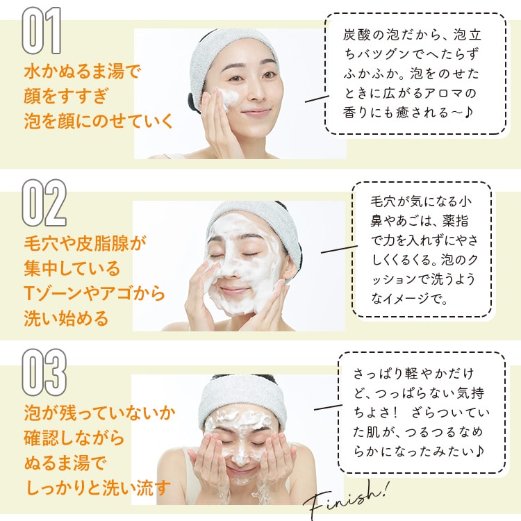 - 水かぬるま湯で、お顔と手を素洗いします。適量(ティースプーン1~1.5杯分)を手のひらにとり、お手持ちの泡立てネット、又は手で、たっぷりと泡立ててください。泡でつつみこむように内側から外側に向かってお顔全体になじませます。水、又はぬるま湯で洗い流してください。