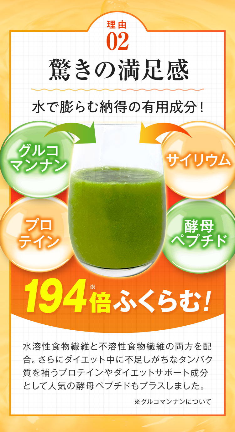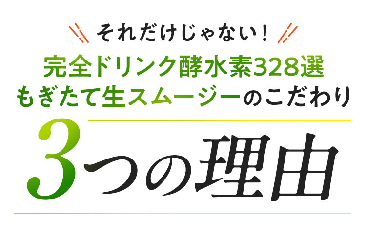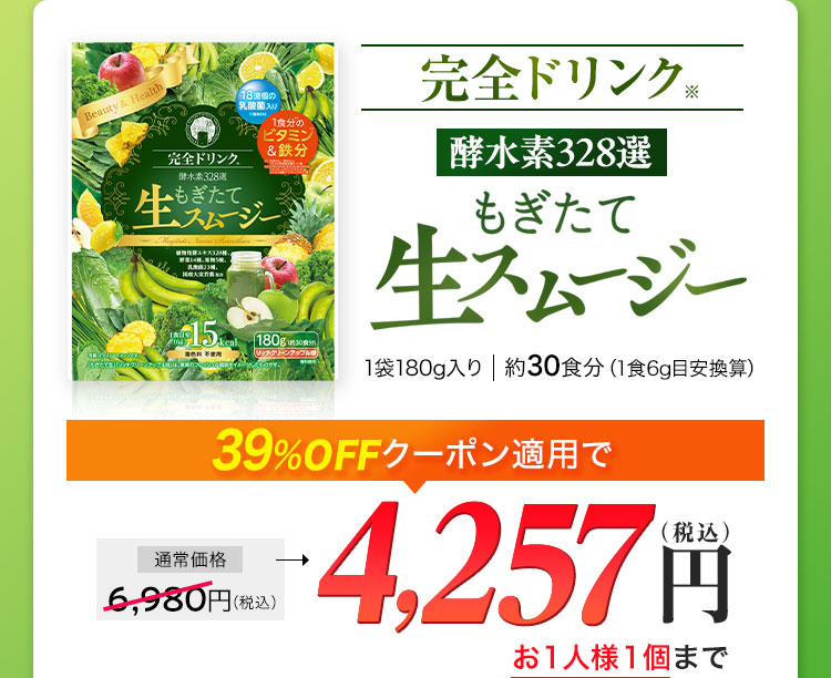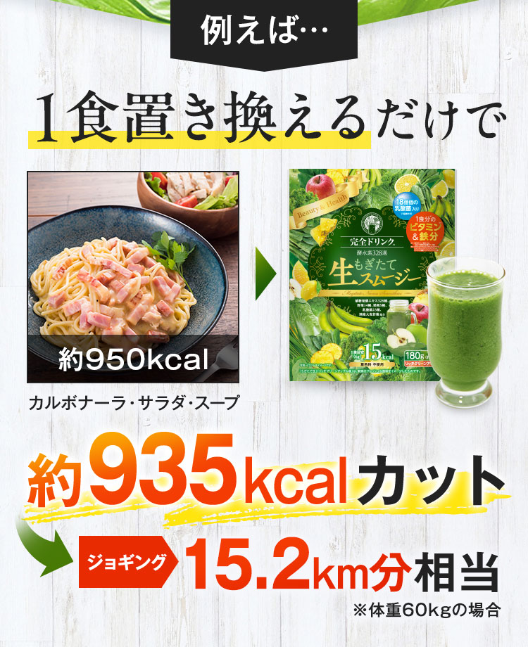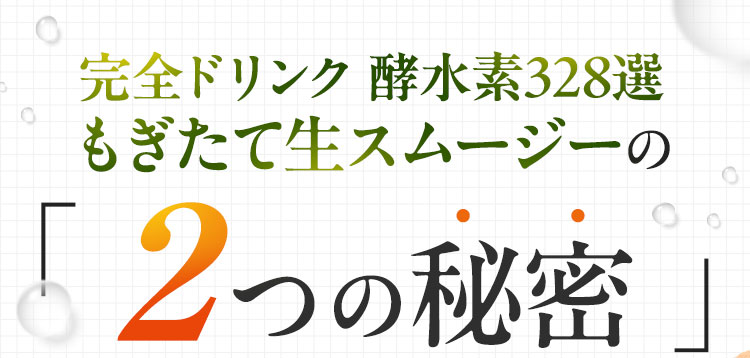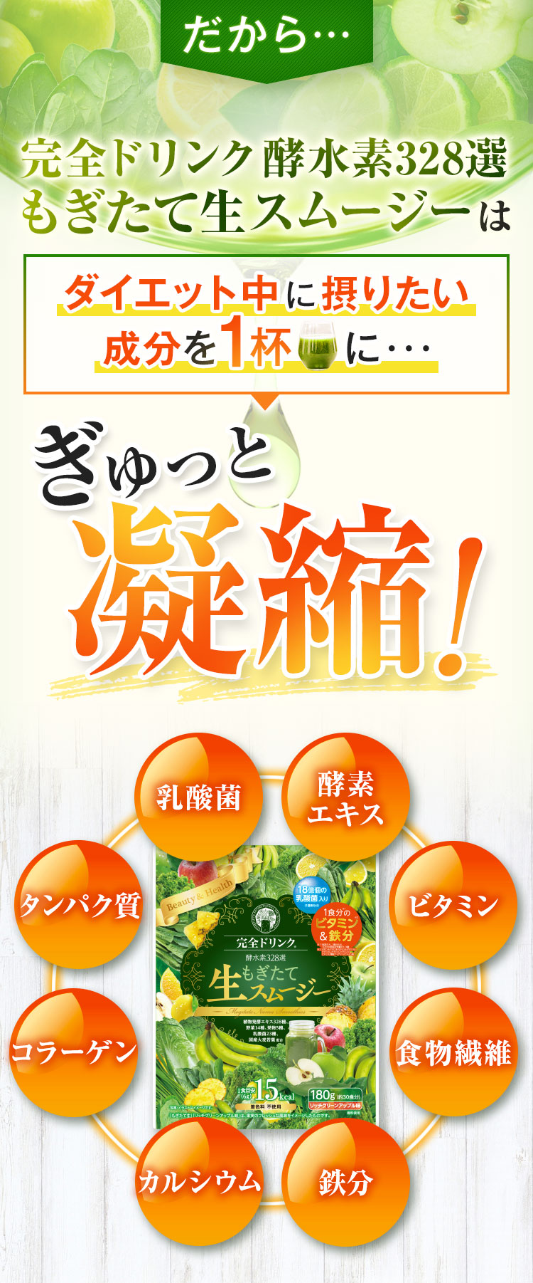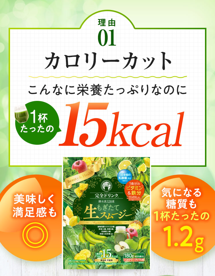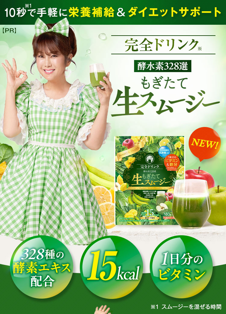 商品名「完全ドリンク酵水素328選もぎたて生スムージー」※ ※: 1杯(本製品1杯(粉末6g)を、約200ccに溶かした場合)約15キロカロリーで、炭水化物および脂質の量を控えめにして、完全な置き換えによって、ダイエットをサポートするための栄養バランスに配慮した設計がされたドリンクです。 尚、これは特定の法律上の定義や認証制度等に基づくものではありません。
