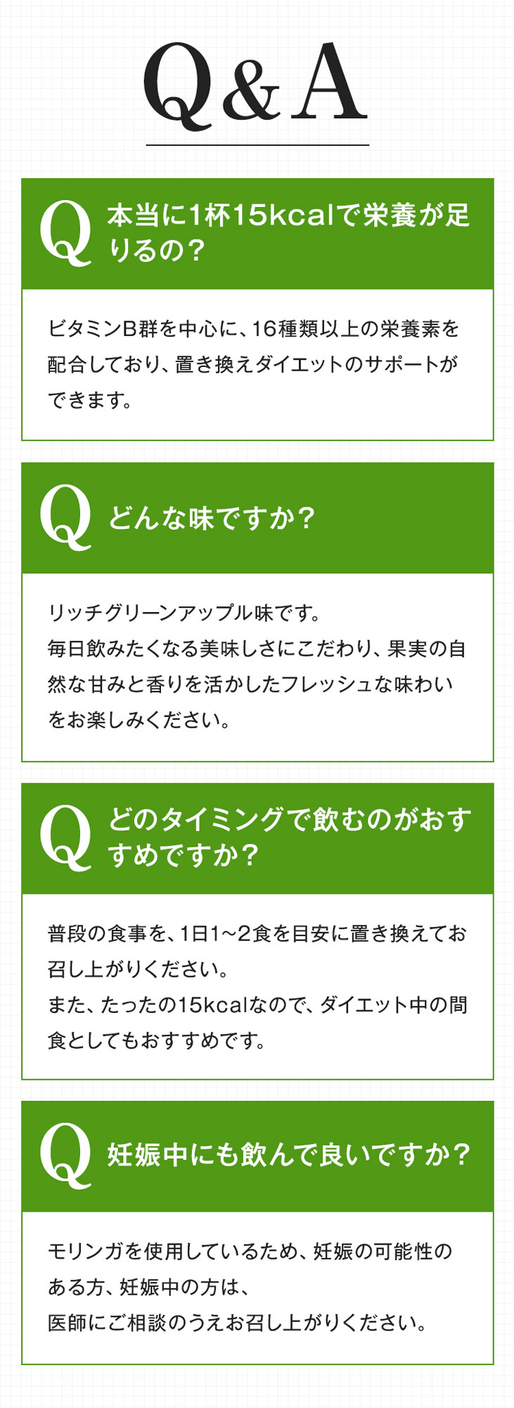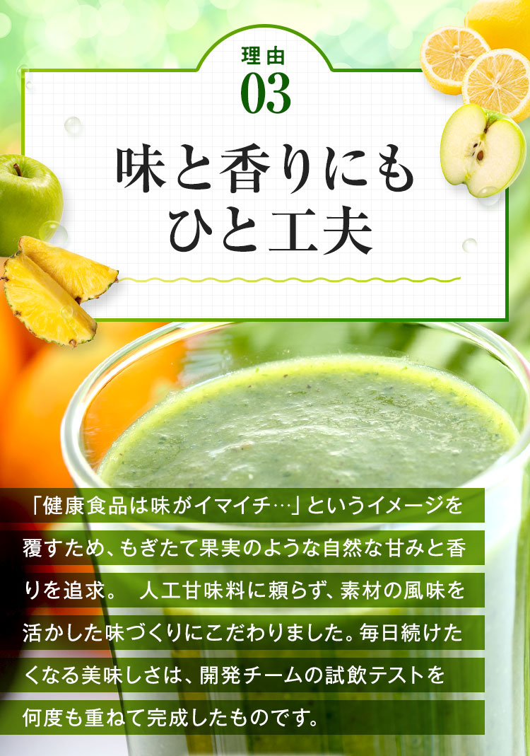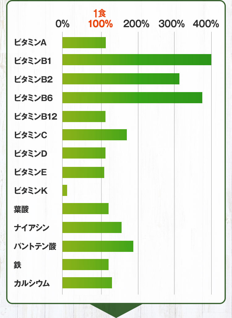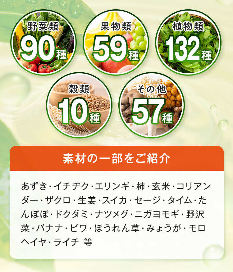 粉末状大豆たん白(中国製造)、ポリデキストロース(水溶性食物繊維)、大麦若葉末、還元麦芽糖、食塩、澱粉、コマツナ末、ブロッコリー末、スピルリナ末、パパイヤエキス、酵母末、植物発酵エキス(オレンジ・カシューナッツ・キウイフルーツ・ごまを含む)、イヌリン(水溶性食物繊維)、オート麦食物繊維、おから末、カルシウム(天然水由来)、きな粉、グルコマンナン、クロレラ末、コラーゲンペプチド(豚肉を含む)、サツマイモ末、シトラス食物繊維、チアシード末、チオクト酸(α-リポ酸)、ニガウリ末、パイナップル果汁末、プランタゴオバタ末、モリンガ葉末、ヤマイモ末、ユーグレナ末、ヨモギ末、りんご食物繊維、レモン果汁末、甘藷若葉末、桑の葉末、酵母エキス、酵母ペプチド、難消化性デキストリン(水溶性食物繊維)、野菜混合末、有機アカシア食物繊維、有胞子性乳酸菌末、バナナ末、りんご果汁末、殺菌乳酸菌混合末(乳成分を含む)、桜の花エキス、プルーンエキス/増粘多糖類、貝カルシウム、クエン酸、ビタミンC、甘味料(アスパルテーム・L-フェニルアラニン化合物、ステビア、スクラロース)、香料、クエン酸カルシウム、ピロリン酸第二鉄、ナイアシン、パントテン酸カルシウム、ビタミンE、ビタミンB₆、ビタミンB₁、ビタミンB₂、ビタミンA、クエン酸カリウム、ヒアルロン酸、酸化マグネシウム、葉酸、リンゴ酸、酸化防止剤(ビタミンC)、ビタミンD、ビタミンB₁₂